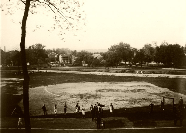 Students participated in a variety of activites during Field Day. In the foreground there is competition in the pole vault. A student is visible on the track in the left foreground and two students are visible on the track to the right in the back. The tracks of the Reading Railroad are visible on the elevated railbed in the backgound of the photograph.. This photograph is from the collection of the Union County Historical Society. |