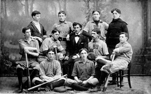 | The 1895 baseball team had a 7-4 record. Most of the games were not with other college teams but with teams from the neighboring towns of Danville, Milton (thrice), Selinsgrove and Watsontown, as well as the Williamsport YMCA. Bucknell played four games with intercollegiate rivals: Gettysburg, Lafayette, and Penn State (twice). Bucknell defeated Gettysburg and Penn State once. This photograph is taken from the 1897 L'Agenda. | |