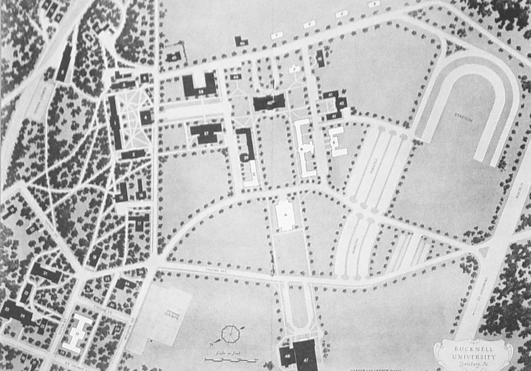 | This map published in 1956 shows the proposed buildings to complete Larsen's vision of the Bucknell Campus.Most of the current buildings built by the 1960's were in the locations indicated except the chapel (A),the new women's dormitoy (D), the new men's dormitory (E), and one of the proposed fraternity hourses (F). | |