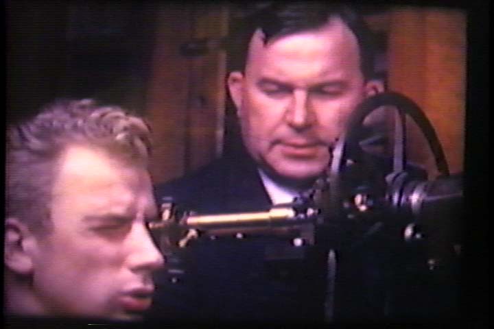 | Professor John Gold observes a student using the meridian circle transit in this image from the 1941 movie, "Days in College." In 1945, John Gold, who had been appointed Director of the Observatory in 1927, was Professor of Mathematics and Astronomy, carrying on the tradition that was begun by William C. Bartol when the Observatory was first constructed of joining mathematics and astronomy. | |