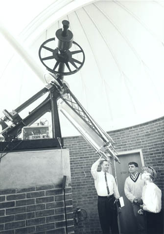 | The the telescope was mounted on the brick pier. The black triangle on the concrete on top of the brick pier is part of the mount. Directly above the mount is the axle which allows the telescope to rotate. Below the mount is an electrical box containing a switch that is used to move the dome. At the top of the photograph is the round wheel-like declination setting circle with counter weights attached. | |