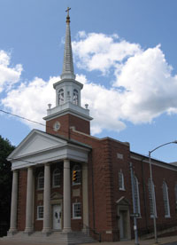 on Whortleberry Street. In 1793 they joined with the Presbyterians to build a log church on the corner of River and Blackberry Streets and this building continued to be used for nearly fifty years. In 1840 a special act of the Pennsylvania Assembly granted the Presbyterians the right to rebuild and so half of the building was sold to the Reformed Church for $400. Once the Presbyterians left, the Reformed Church decided to rebuild as well and in 1847 a new brick church was erected.
