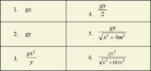 A particle is initially at rest at the top of a curved frictionless track. The x- and y-coordinates of the track are related by y=x2/(4 m), where the positive y-axis is in the vertical downward direction. As the particle slides down the track, what is its tangential acceleration? (In all answers, g is the acceleration due to gravity and "m" is meters.) |