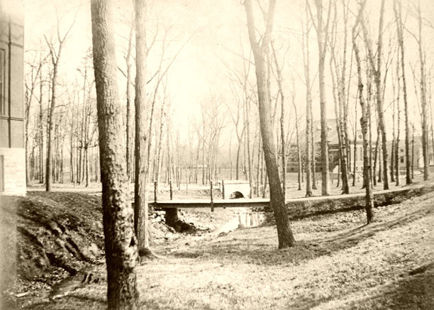 The side of the Chemical Laboratory is slightly visible to the far left in the photogrpah. In the center background is the bridge over which Loomis Street passes. The bridge next to the Chemical Laboratory is in the center foreground. To the right of the bridges is Bucknell Hall, and to the very far right the President's House is barely visible. The photograph is provided by the Union County Historical Society. |
