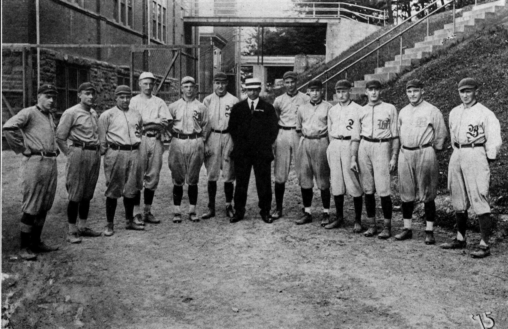 | Members of the 1915 baseball team posed next to Tustin Gymnasium for this photograph which appeared in the 1917 L'Agenda. Tustin Gymnasium is to the front left in the photograph and the Physical Laboratory is to the back left. The smokestack of the Heating and Lighting Plant is visible next to the building. The concrete steps to the right went to a path that lead to the college buildings on the top of the hill. | |
