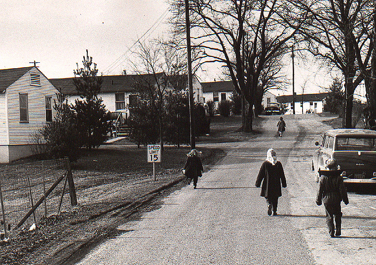 After leaving the school bus, children hurry to their homes in Bucknell Village.